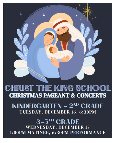 Kindergarten through 2nd grade will perform at 6:30pm on December 16th. The 3rd grade pageant will be at 1:00pm and 6:30pm on December 17th along with the 4th & 5th grade concert.