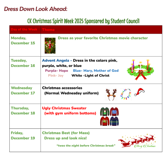 CK's Student Council is organizing a giving tree this holiday season for the children at Our Lady of the Angels Mission. Unwrapped gifts can be dropped in the back of church through December 8th. Click here for more info.