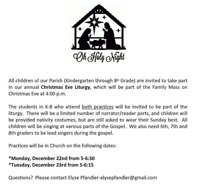 All children of the parish are invited to take part in our annual Christmas Eve liturgy. Click here for details.